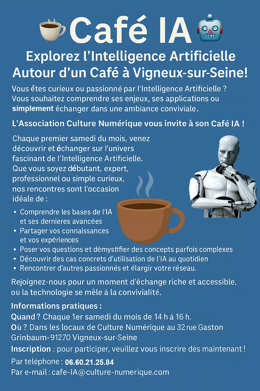 Sur inscription au 06 60 21 25 84 ou cafe-IA@culture-numerique.com .