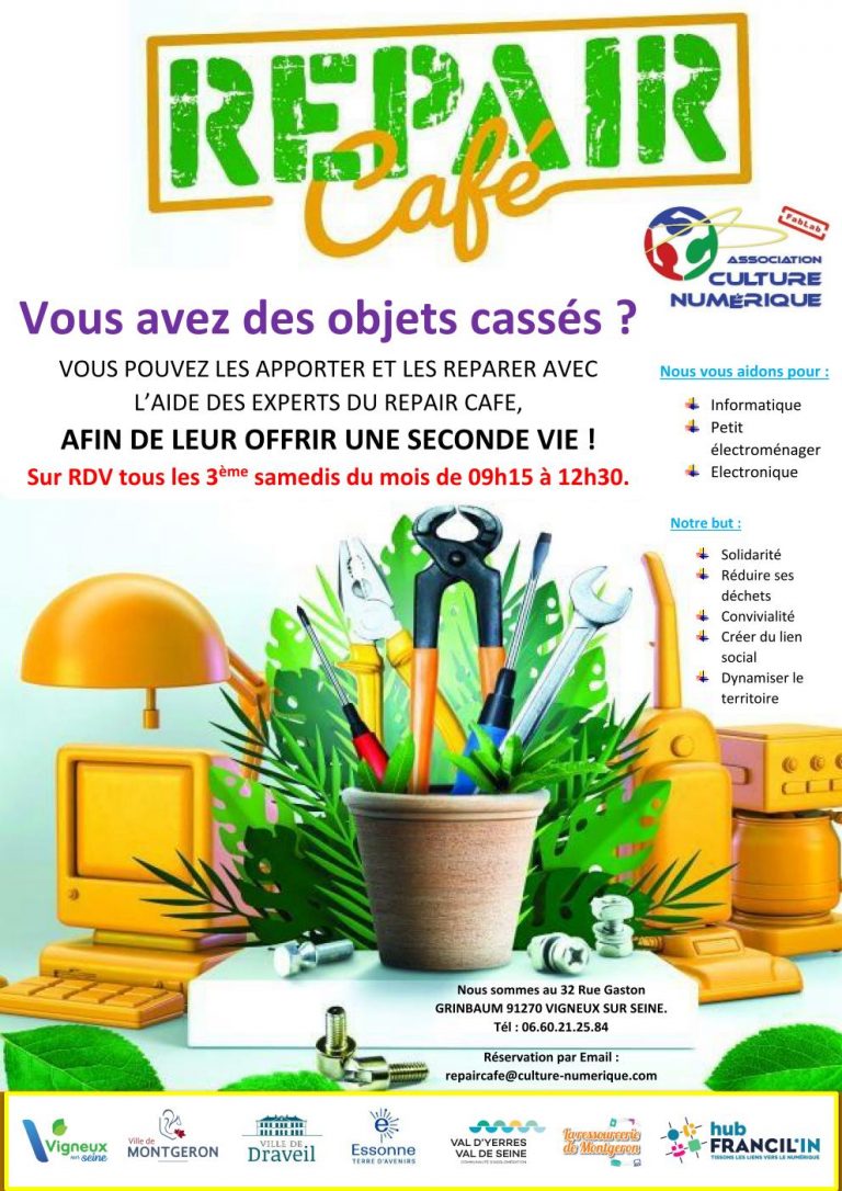 Sur réservation par appel téléphonique au 06.60.21.25.84 ou par Email à repaircafe@culture-numerique.com
