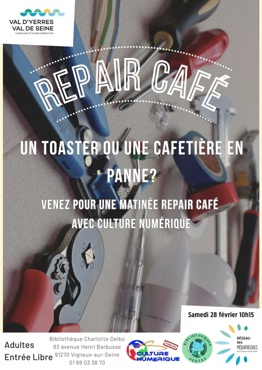 Samedi 28 février 2026 à 10h15 Repair-Café à Vigneux-sur-Seine avec Culture Numérique Apportez vos petits objets du quotidien en panne comme un Toaster ou une Cafetière ! Entrée Libre Bibliothèque…